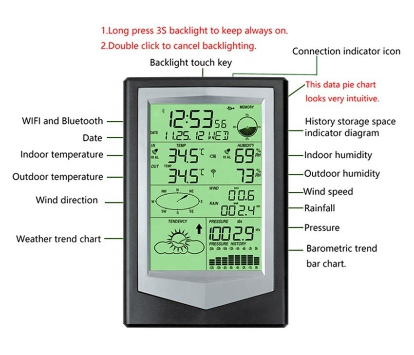 Verandanın yağmur ve UV korrosyonuna karşı yerleşik,hava sıcaklığını, nemini ölçmek