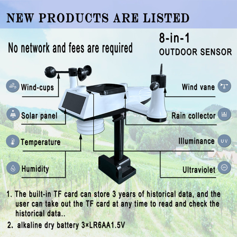 2Bu makinenin algılama işlevleri: sıcaklık, nem, rüzgar hızı, rüzgar yönü, yağmur, aydınlatma, ultraviyole ışınları.